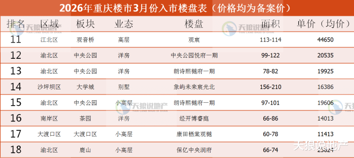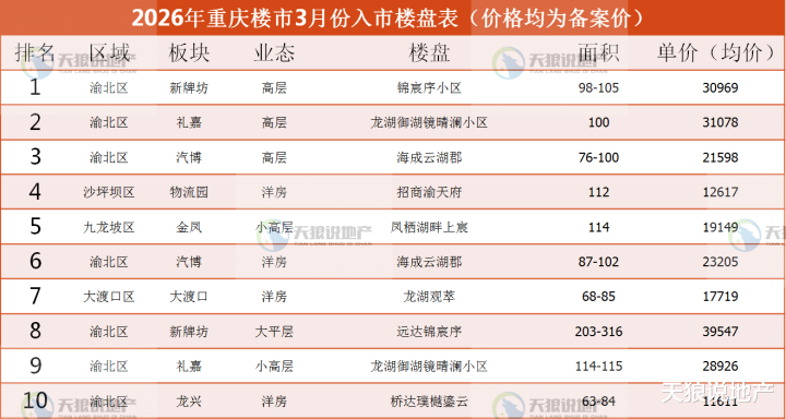 附:2026年3月重庆楼市入市楼盘表(因为供应端标的如故相比少,是以就不作念排名榜了)